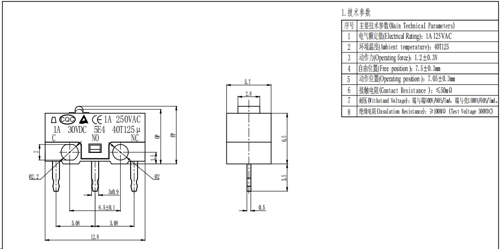 Folosind un mecanism brevetat de declanșare rapidă cu acțiune rapidă, timpul de răspuns la declanșare este ≤8 ms, îmbunătățind performanța cu 25% în comparație cu microcomutatoarele tradiționale. Cursarea declanșatorului este controlată cu precizie între 0,3-1,0 mm, cu un interval de forță de operare de 1,5-4N. Feedback-ul de apăsare este clar și clar, fără lipire sau joc liber, permițând controlul precis al „atingere ușoară pentru a conecta, eliberare pentru a rupe”, perfect potrivit pentru scenariile care necesită o sensibilitate mare de declanșare. Contactele sunt realizate din aliaj de argint-staniu de înaltă puritate și prelucrate cu sudare precisă în puncte, cu o rezistență inițială de contact de ≤30mΩ. Sarcina nominală acceptă 1A/250V AC și 3A/125V AC, prevenind eficient încălzirea prin contact sau arderea atunci când trece curentul.