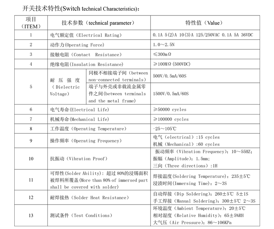 | 1 | Evaluare electrică | 0.1A 5(2)A 10(3)A 125/250VAC 0.1A 5A 36VDC | |